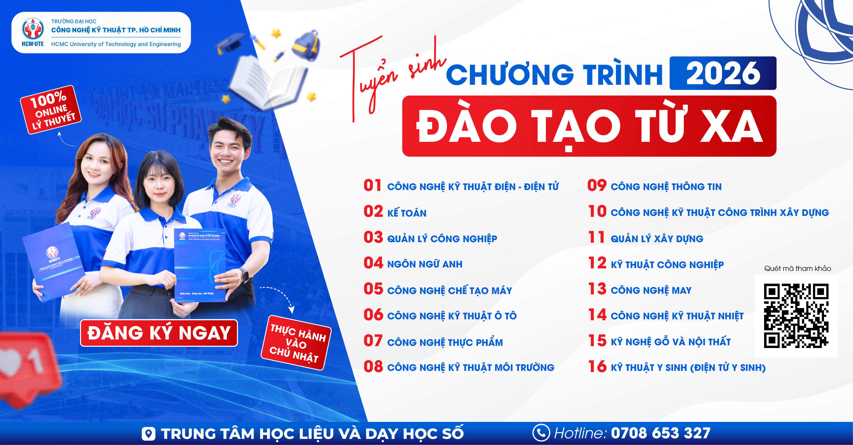 Trung tâm Học liệu và Dạy học số (gần Hội trường lớn) Địa chỉ: Số 1 Võ Văn Ngân, Phường Thủ Đức, Thành phố Hồ Chí Minh. Điện thoại: 028.3722.3504, Hotline: 0708.653.327, Email: hldhs@hcmute.edu.vn